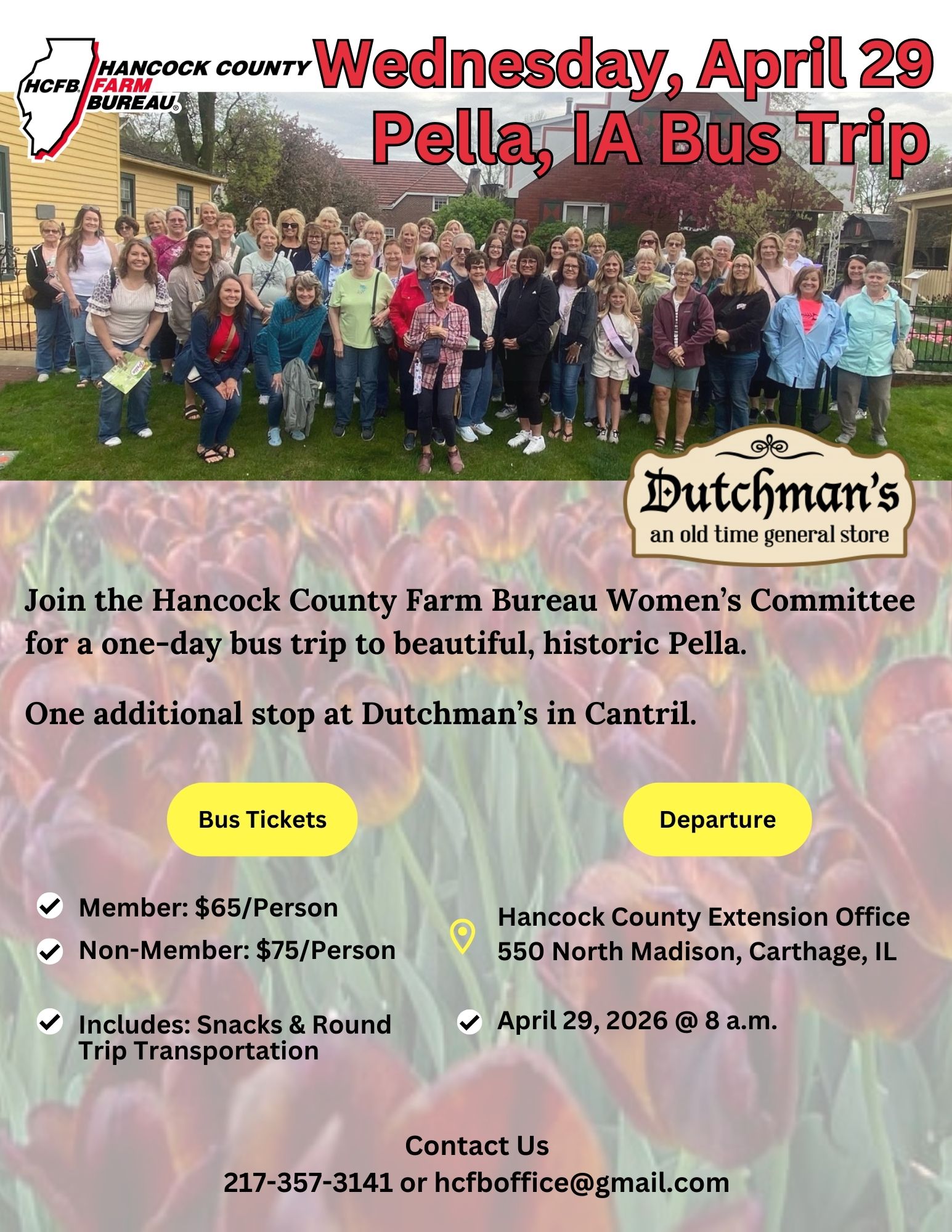 The Hancock County Farm Bureau Women’s Committee is excited to announce its upcoming Spring Bus Trip, scheduled for Wednesday, April 29, 2026. This one-day excursion will take participants on a scenic journey to Pella, Iowa, just in time for the vibrant Tulip Festival. It promises to be an unforgettable day full of beautiful sights, shopping, and cultural exploration. The trip will also include a stop at the Dutchman’s in Cantril, IA, before returning to Carthage.
